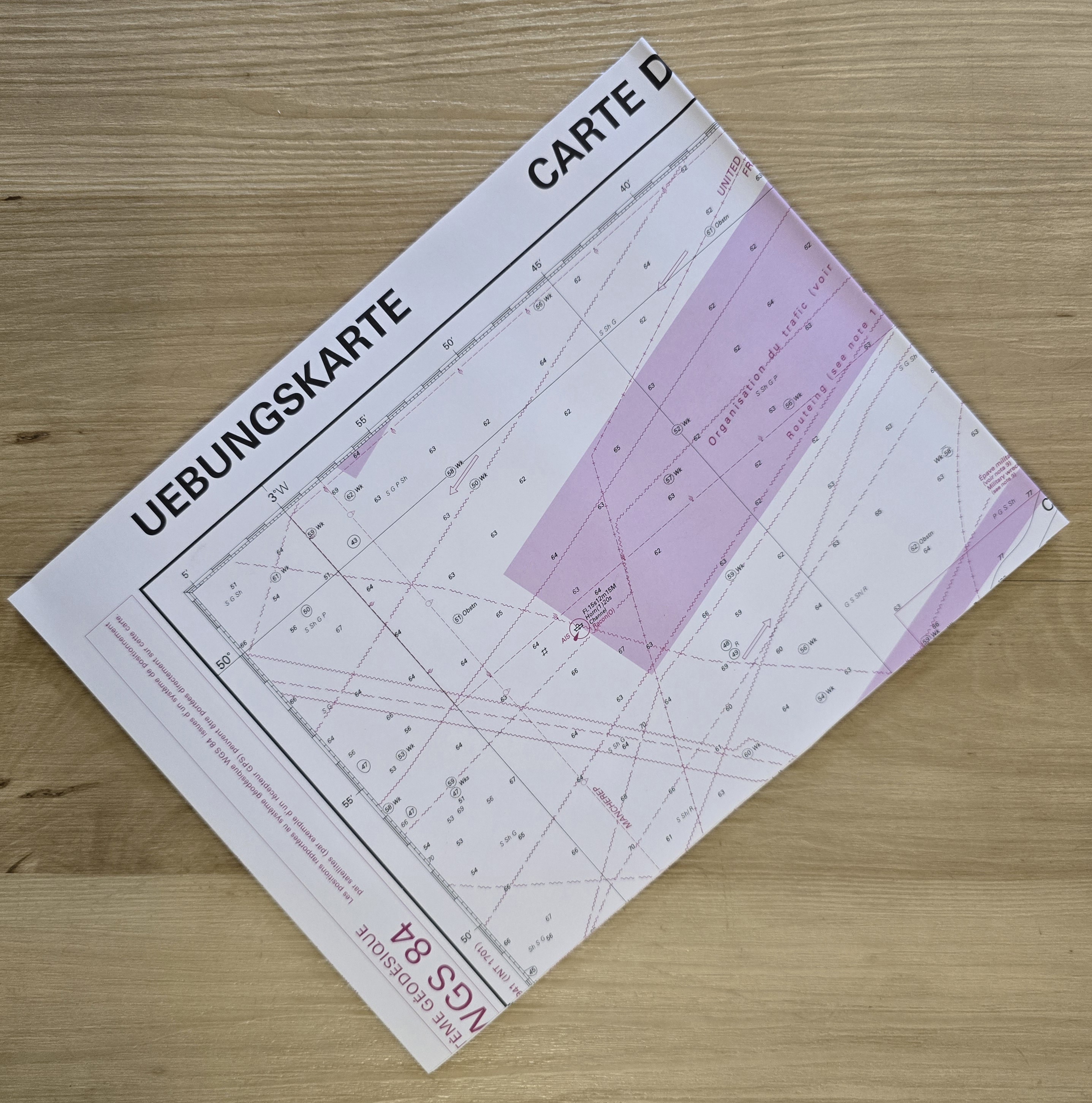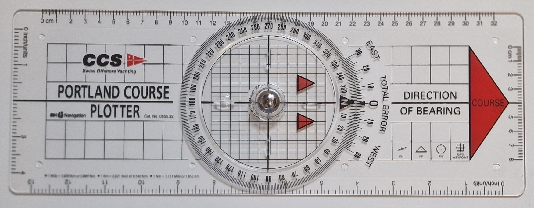 Der aus der britischen Seefahrt bekannte Navigations-Plotter "Portland Course Plotter", kann in nahezu jede Position auf der Karte ohne Verschieben nach rwN ausgerichtet werden, da sich zu dem großflächigen Raster seiner drehbaren Rose immer eine waagerechte oder senkrechte Linie auf der Karte finden läßt.